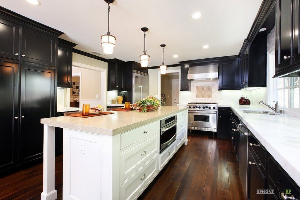 Возможен и иной вариант. Зональная расположение. Например, часть снизу пространства на кухне делается темная, в то время как потолок, и также верхний гарнитур кухни – светлого. Либо весь гарнитур кухни покупается черного цвета, а пол, потолок и стенки компонуется светлым оттенком.