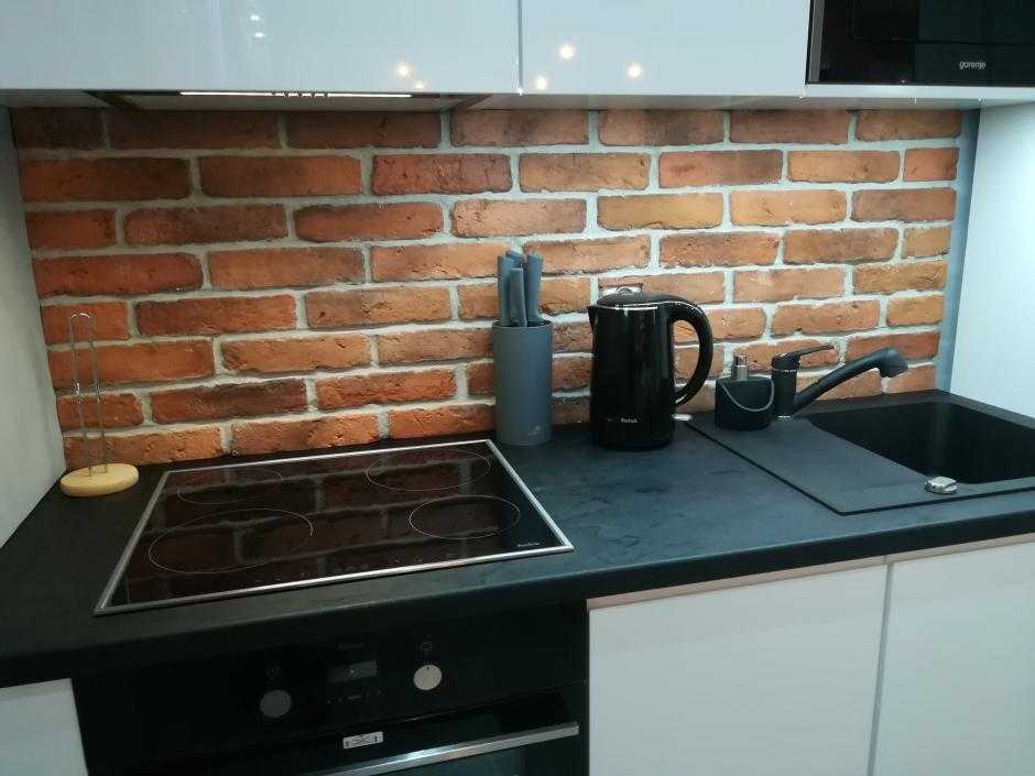Фартук на кухне в стиле лофт можно оформить керамической плиткой под “кирпич”.