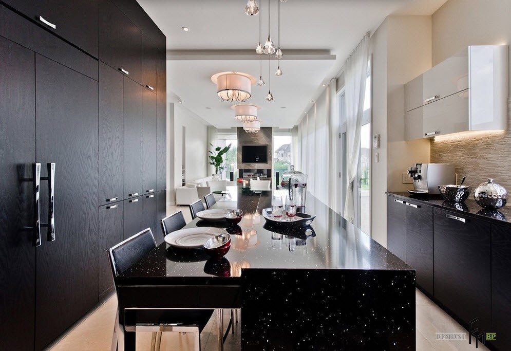 Красиво будет смотреться черный стол на ножках из металла, с черной, тонированной столешницей из стекла. Можно разбавить интерьер яркими однотонными деталями и аксессуарами. Фасады кухонь чаще всего делаются глянцевыми, блестящими, а потолок лучше всего подойдет натяжной.