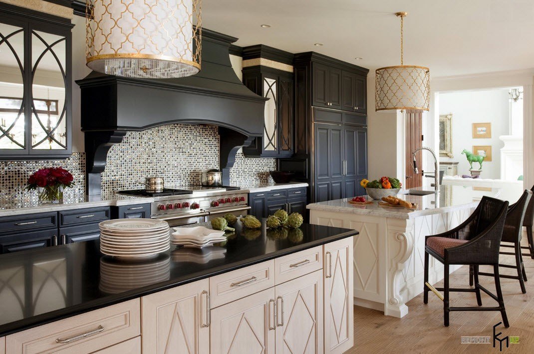 Во время покупки гарнитура кухни, напольных материалов для отделочных работ, потолка и стен, и также элементов декорирования следует руководствоваться принципом чередования белого и черного цвета. Профессионалы области дизайна также называют подобный вариант «зеброй». Белые оттенки и черного необходимо использовать по очереди. К примеру, если покрытие для пола белое, то находящиеся снизу шкафы необходимо делать черного цвета, создавая при этом просветы.