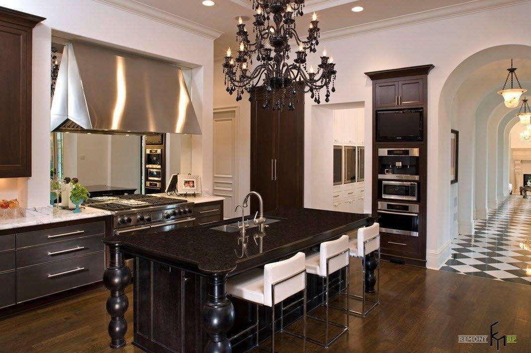 Этот роскошный кухонный остров в черном цвете привлекает к себе внимание всех гостей и домочадцев, но во многом благодаря изящной темной люстре. Выразительный контраст здесь создают белоснежные стулья в современном стиле и светлые стены – смелый, но очень изысканный дизайнерский прием
