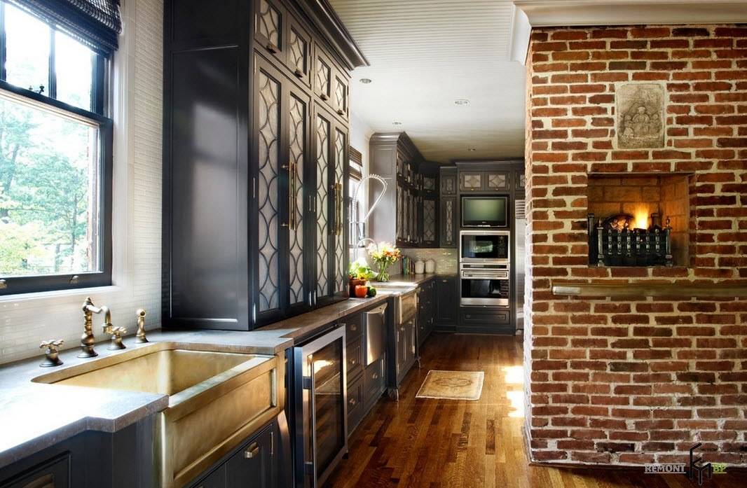 В отделке уместны такие материалы, как хром, сталь, стеклянные поверхности. Интересно будет смотреться отделка одной из стен кухни кирпичом, выкрашенная белым цветом. Темные фасады можно дополнить мягким светом встроенных светильников.