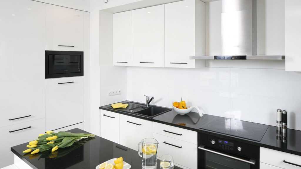 Белая кухня с черной столешницей и полом потребует постоянного тщательного ухода из-за капризности и любви к чистоте черного