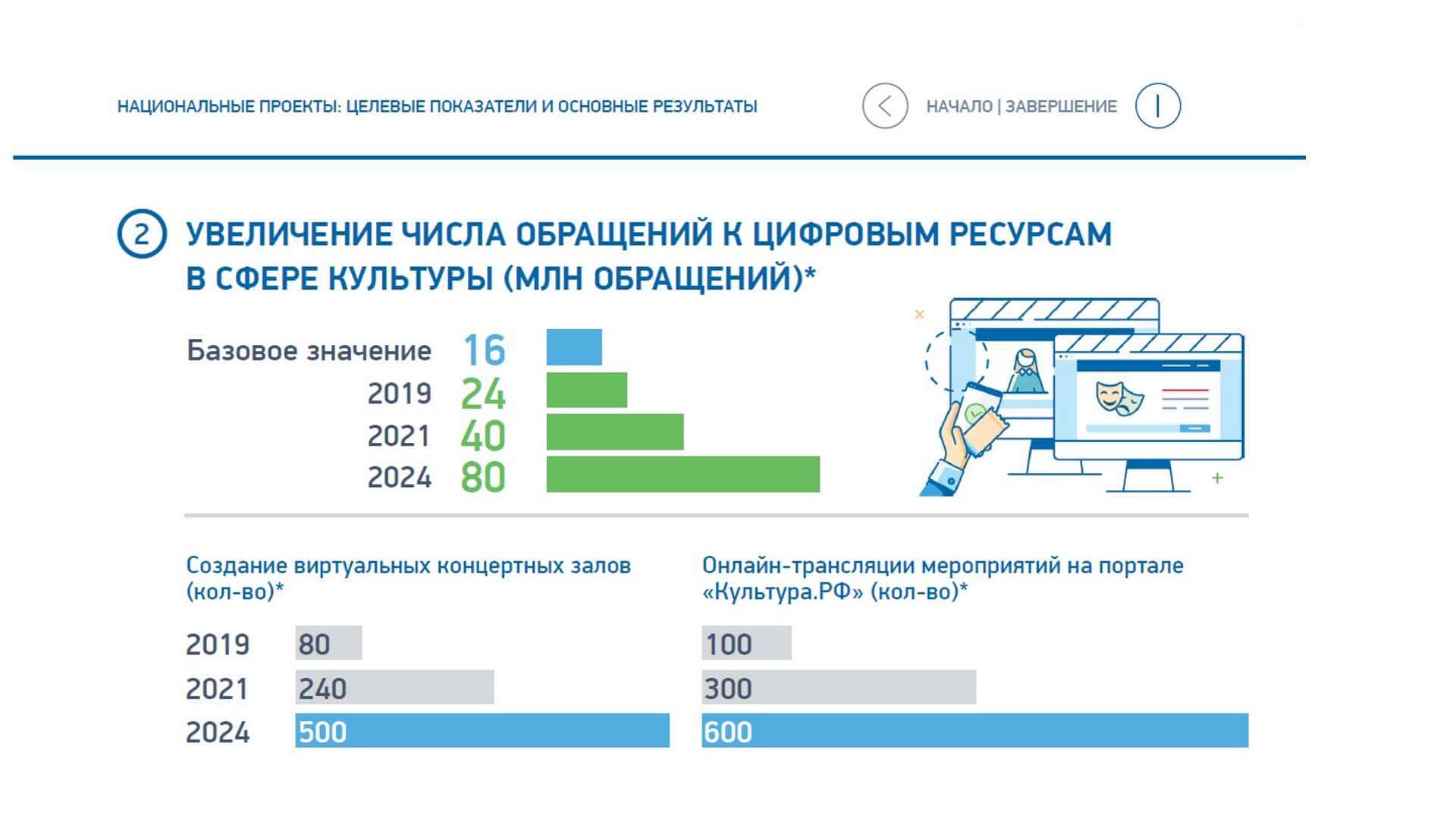 Цель проекта виртуальный концертный зал — повысить уровень культуры общества за счет достижения показателей и проведения онлайн-трансляций концертных программ по всей России.