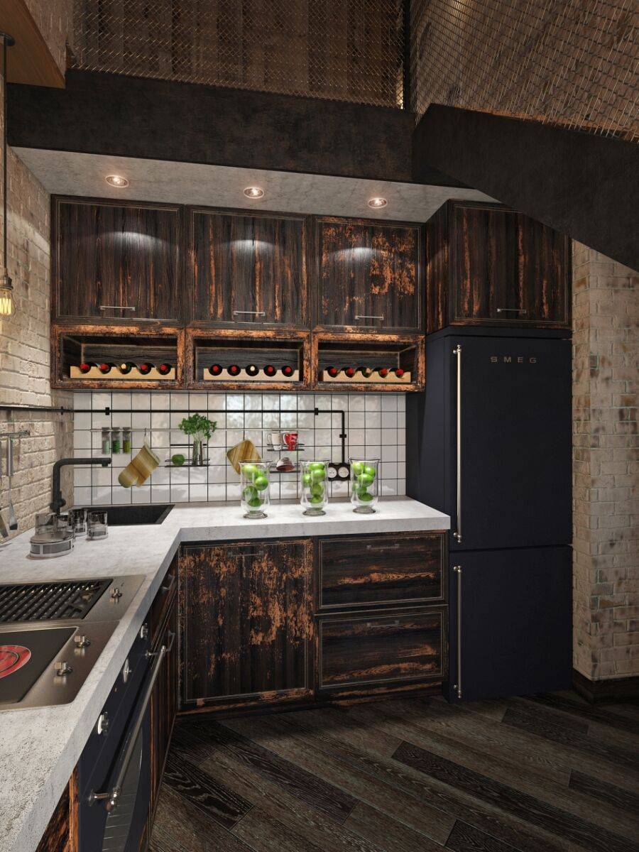 Черно-коричневый кухонный лофт-интерьер