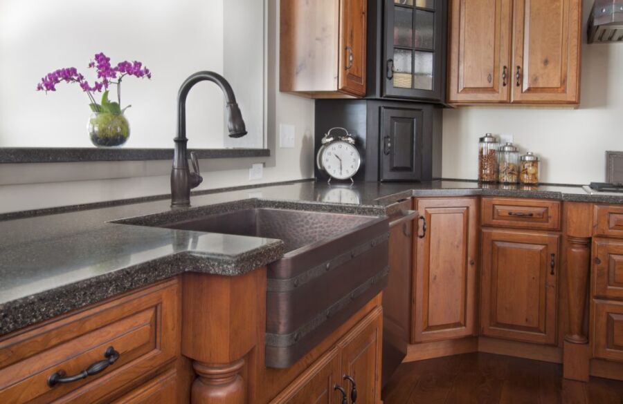 Выбор столешницы напрямую зависит от степени насыщенности фасада. Темная деревянная поверхность с текстурой хорошо сочетается со столешницей одного тона, с гладким покрытием, темной или светлой.