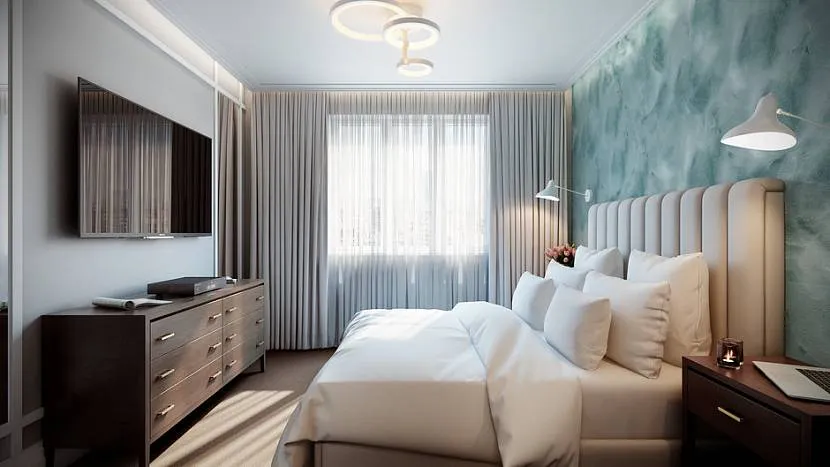 Если небольшая по площади спальня в городской квартире темная, нужно позаботиться о правильном освещении этого пространства. Тогда оно приобретет уютную атмосферу, душевное тепло и веселое настроение. Хорошо освещенная спальня – залог прекрасного самочувствия ее обитателей. Отличным вариантом может стать многоуровневый потолок со светодиодной подсветкой и центральным освещением в виде люстры. Подсветку хорошо включать в вечернее время для создания интимной обстановки, которой должна славиться спальня. А вот днем можно пользоваться светом от люстры, подвешенной по центру помещения. Зонирование при помощи точечного света позволит сделать акцент на конкретной части пространства комнаты. Такой дизайн всегда выглядит гармонично, лаконично, а жить здесь человеку будет комфортно и приятно.