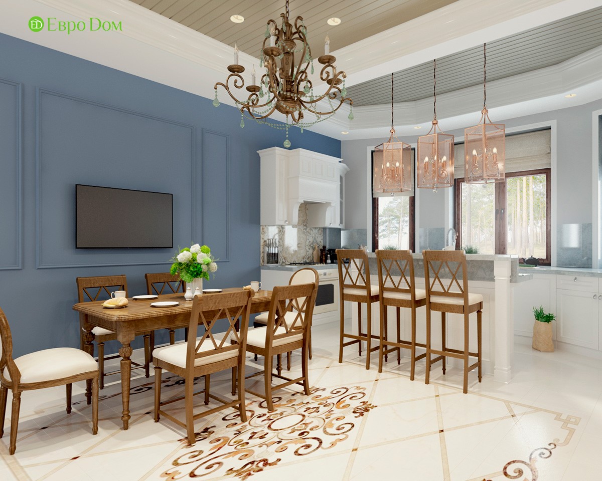 Сочетание белого с синим ассоциируется с морем и… морской державой. Благодаря свежему взгляду на английский стиль, в этом интерьере в синий цвет выкрашена большая стена. Светло-серая обшивка потолка узкими панелями напоминает палубу. Белый пол и кухонная мебель служат отличным фоном для добротного стола и стульев из натурального дерева. Изысканный декор на полу и массивная винтажная люстра привносят в интерьер утончённость и шик.
