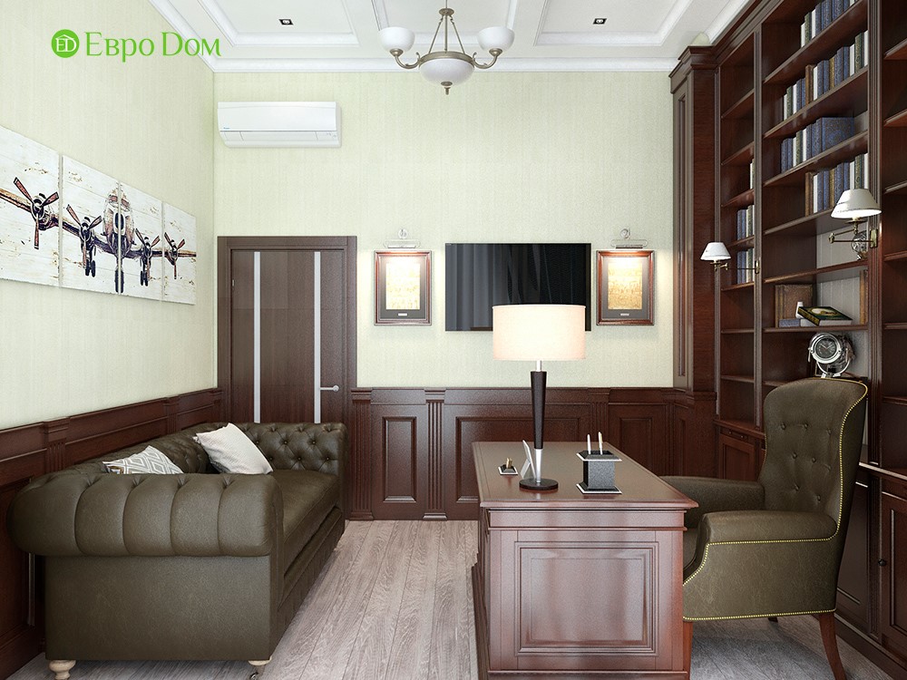 Укромное место для чтения и письма, грамотно обставленный кабинет составляет гордость хозяина. На этой фотографии – лаконичный интерьер кабинета, в котором нашлось место даже мягкому дивану и ТВ. Сочетание бледно-зелёных стен с тёмными панелями и мебелью смотрится выразительно и строго. В роли декора выступает модульная картина над диваном, добротное кресло и знаменитый диван «честер».