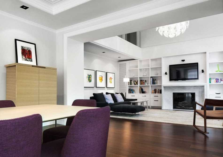 - Неоклассика. В сдержанном неоклассическом стиле минимум мебели и преимущественно светлая палитра. Контрастов мало — максимум 1–2 ярких кресла / большая пестрая картина на стене / ковер с абстрактными узорами. Покрытия пола лучше выбирать одинаковыми — так будет создаваться ощущение единства.