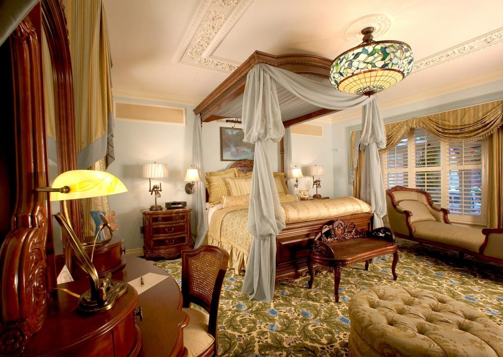 Спальня в викторианском стиле должна выглядеть не только помпезной, но и уютной, поэтому современные дизайнеры рекомендуют дополнять основной источник света бронзовыми настольными лампами, торшерами с эксклюзивными абажурами из бархата, шелка и атласа, элегантными бра.