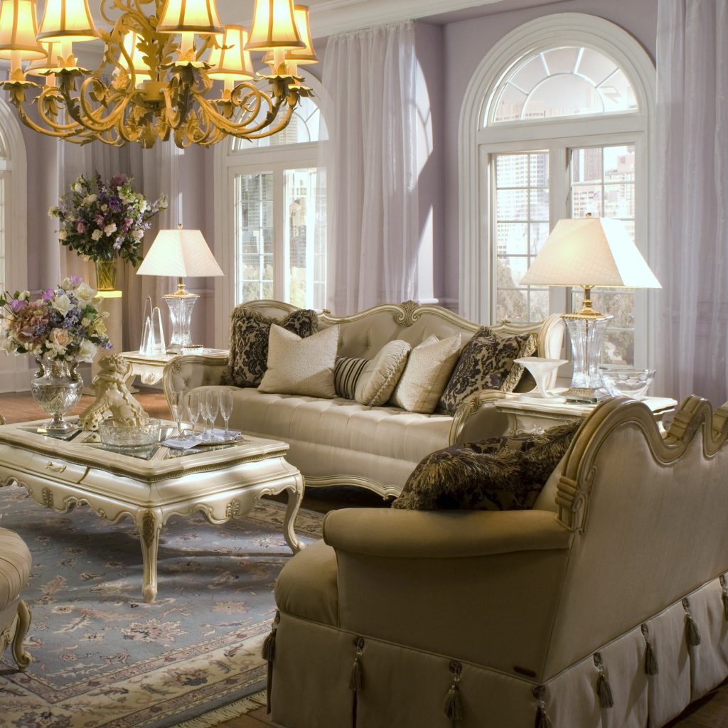 Основное требование к мебели – удобство. У диванов присутствуют мягкие подушки, а стулья имеют высокие спинки и подлокотники. Вставки у шкафов могут быть выполнены из витражей или полностью прозрачного стекла.