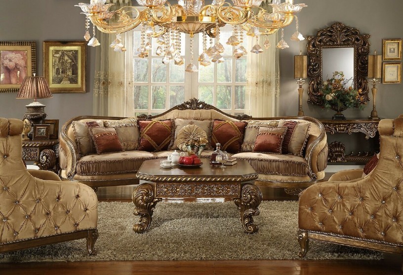 Диваны, кровати, кресла, столы и стулья – объемные и массивные, дополнительно украшены резьбой, мягкая мебель с качественной, толстой обивкой. Актуальными предметами меблировки также являются комоды, сундуки и напольные часы.