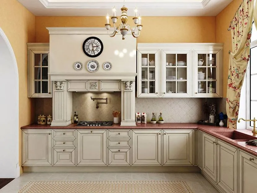 Теплые цвета. Предпочтение в классических интерьерах отдается натуральным оттенкам желтого, песочного, персикового, оливкового и терракотового цветов. Контрастные сочетания в этом стиле используются реже, а яркие акцентные вкрапления и вовсе исключены. Темные цвета смотрятся благородно, а светлые или белые кухни выглядят очень торжественно, особенно если дополнены позолотой или патиной.