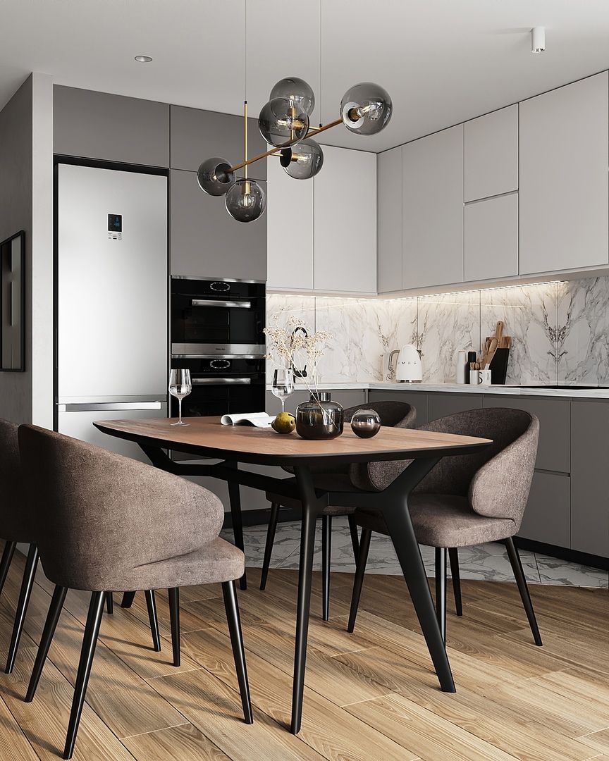Если дом или квартира достаточно просторные, зону столовой оптимально перенести в отдельное помещение, а на кухне предусмотреть остров с местом для перекусов и кофе-пауз, подобрав несколько стульев как в столовой, только на высоких барных ножках.