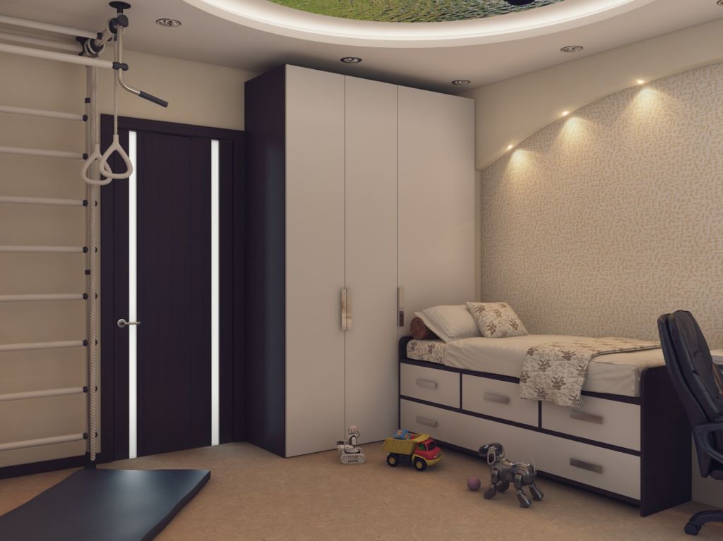 Допускается поставить компактную мебель-трансформер, которая занимает немного места. Для сна можно использовать раскладные диваны или компактные прямоугольные кровати. Также не лишними будут ящики для вещей и игрушек, при помощи которых мальчишка или девочка приучатся к организованности.