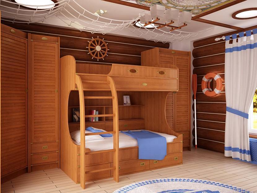 Морской стиль. Комната, оформленная в синих тонах, выглядит гармонично и подходит детям обоих полов. Для мальчиков подбирается декор, связанный с кораблями, пиратами, сокровищами, в отделке используется сине-белая гамма, темное дерево, красные акценты. Девочкам (и мальчикам тоже) подойдет стиль прибрежного коттеджа (средиземноморский), разбавленный теплыми коричневыми тонами.