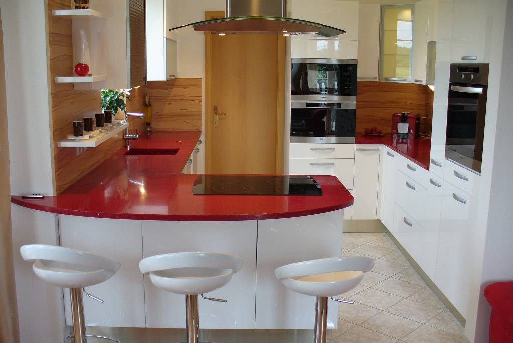 При оформлении кухни в таком стиле, стоит учитывать оптические свойства красного цвета. Разрабатывая дизайн кухни, красные оттенки лучше использовать только как акцентирование внимания на каком-то элементе, чтобы не перегрузить пространство.