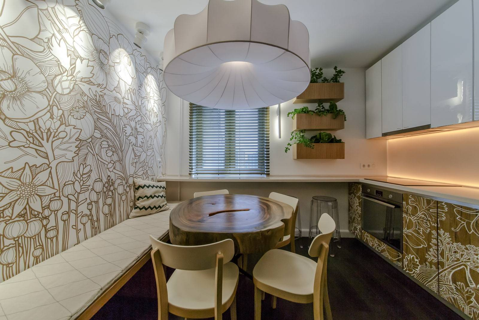 При угловой планировке кухни сложно найти место для барной стойки: человек, который будет за ней сидеть, наверняка помешает проходу остальных, поэтому стоит остановиться на классической обеденной зоне с диваном.