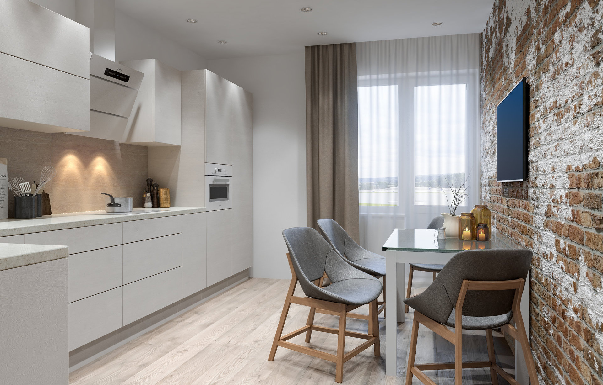 Минус в том, что часто при такой расстановке гарнитура не остается места для обеденной зоны, и ее переносят в другую комнату. Иногда у одной стены ставят барную стойку, но она по комфорту никогда не заменит обеденный стол.