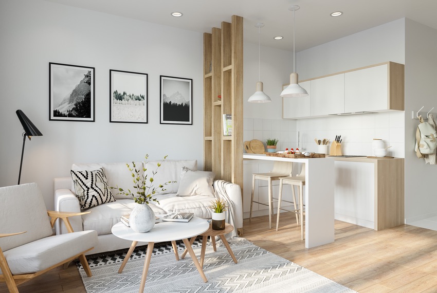 Декоративные перегородки идеально подходят для зонирования кухни-гостиной 17 кв. метров