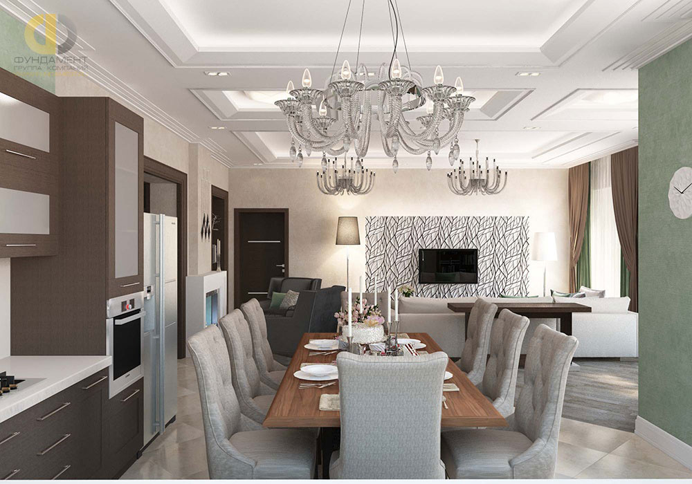 Особое внимание стоит уделить потолку. Подвесная конструкция позволит соединить все функциональные зоны в одно целое