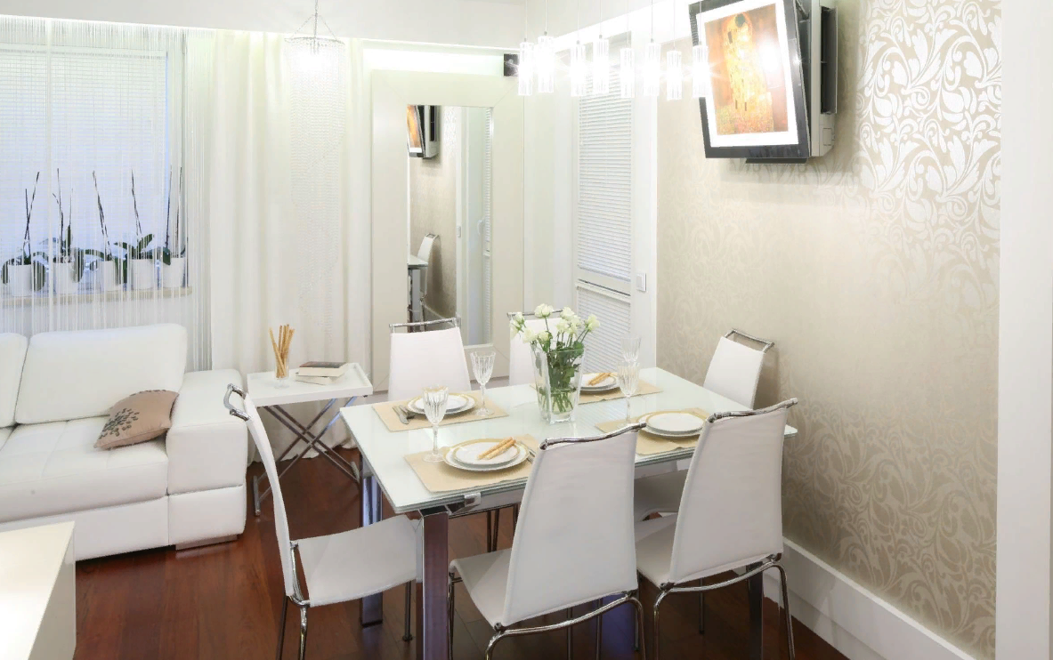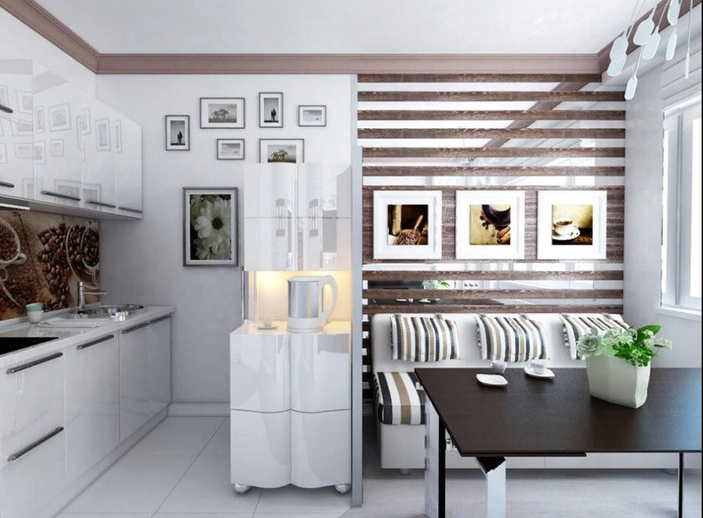 Удачный способ расширить площадь – желто-белый тандем. Эти тона компенсируют недостаток квадратуры и притягивают освещение. Для визуального разделения площади используйте контрастные элементы – картины, домашние цветы и различные светильники.