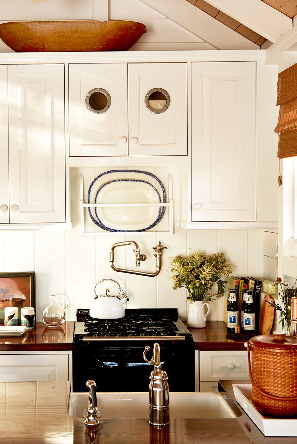 Традиционная белая с легким лимонным оттенком меблировка, характерная для стиля кантри и неожиданные гнутые линии и изгибы, присущие модерну, в сочетании с темной древесиной столешниц и высоких стульев смотрится эффектно и статусно.
