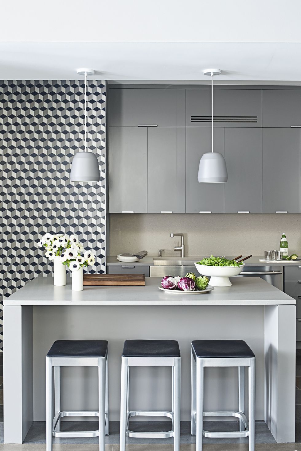 Чтобы немного облегчить уборку, воспользуйтесь серыми оттенками. Они помогут сымитировать натуральный камень или сталь. Если вы сдержанный человек и любите строгость в дизайне — пепельный цвет для вас. Чтобы разбавить скучную серую гамму, расставьте акценты, используя палитру радуги.