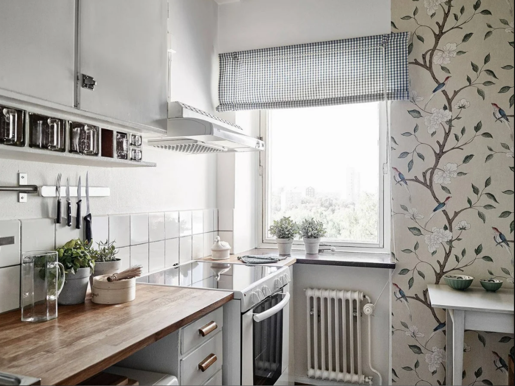 Дизайнеры советуют выбирать настенное покрытие и кухонный гарнитур для маленькой кухни в одном оттенке. Так даже крупные шкафы будут смотреться менее громоздко.