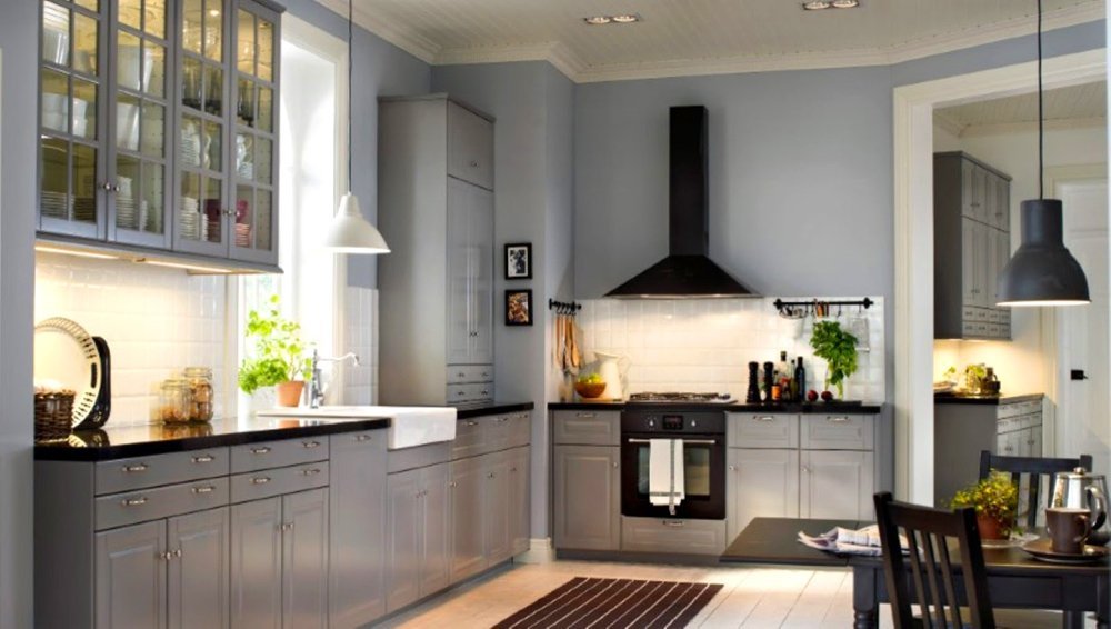 Серая мебель с металлическими элементами придает урбанистический оттенок, зато фасады с аккуратными формами уместны даже в деревенском доме.