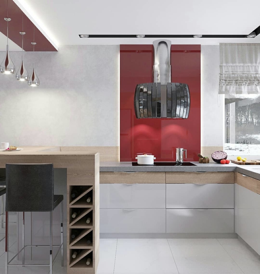 Наиболее выигрышно смотрится ансамбль из гарнитура с глянцевым бордовым фасадом, белой столешницы и острова. При этом желательно, чтобы стены, пол и потолок были кипенно-белыми. К сожалению, обладать подобной кухней может себе позволить лишь чистоплотная особа. На практике такое решение крайне нерационально, поскольку предполагает необходимость проведения ежедневных уборок.