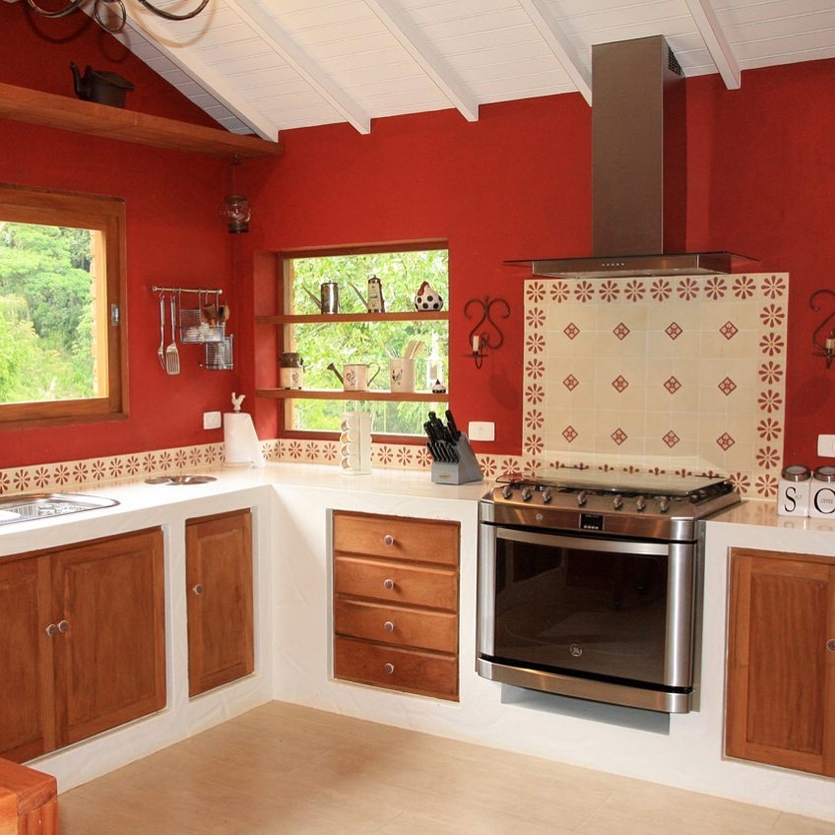 10. Уравновешивание. Снизить активность дизайна кухни с красным гарнитуром можно не только с помощью других цветов. Выбрав для оформления стиль кантри, рустик или минимализм, вы отойдете от ассоциаций с излишней вычурностью