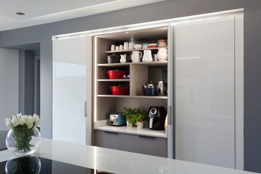 Отличные рабочие светильники — светодиодная лента или встроенные в корпус гарнитура лампы. Особенно интересно такая подсветка выглядит в стилях хай-тек или минимализм.