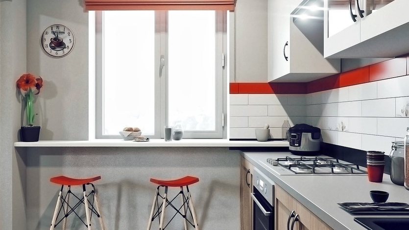 Г-образный красный гарнитур экономит время на передвижение по кухне, подходит для небольшого пространства. Здесь эргономично расположена кухонная мойка или варочная плита в углу, есть емкий нижний шкаф. Для маленьких комнат подойдет гарнитур с барной стойкой, к которой можно пристраивать стол.