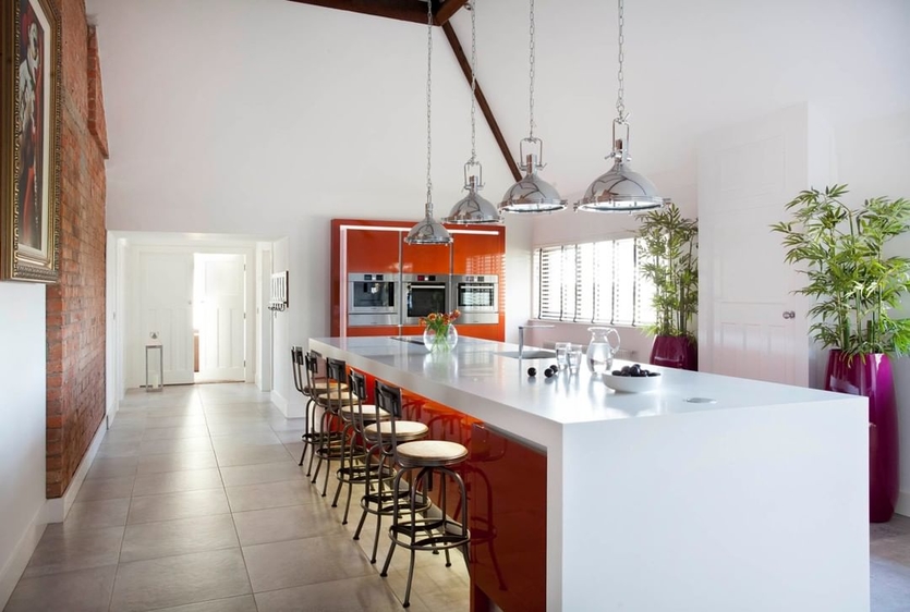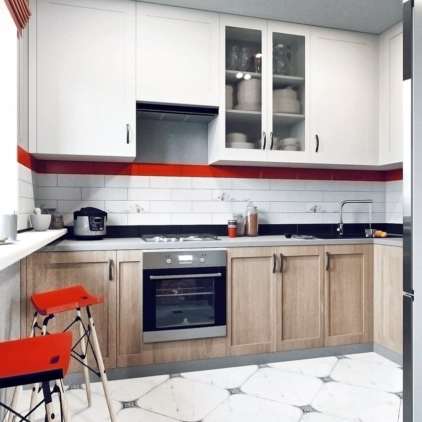 3. Единичный акцент. Красный акцент в обстановке может быть и одним-единственным (холодильник, фартук, угловой шкаф гарнитура, диван, обои на акцентной стене, кухонный остров).