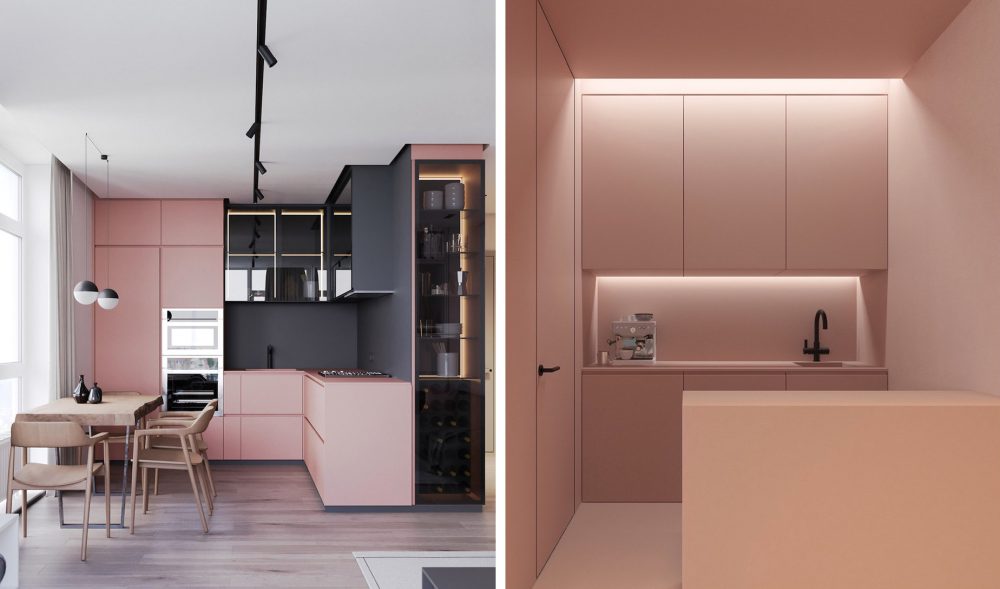 - Необычно романтично, воздушно выглядит кухня в бело-розовом цвете, возможно с дополнением дымчато-серого.