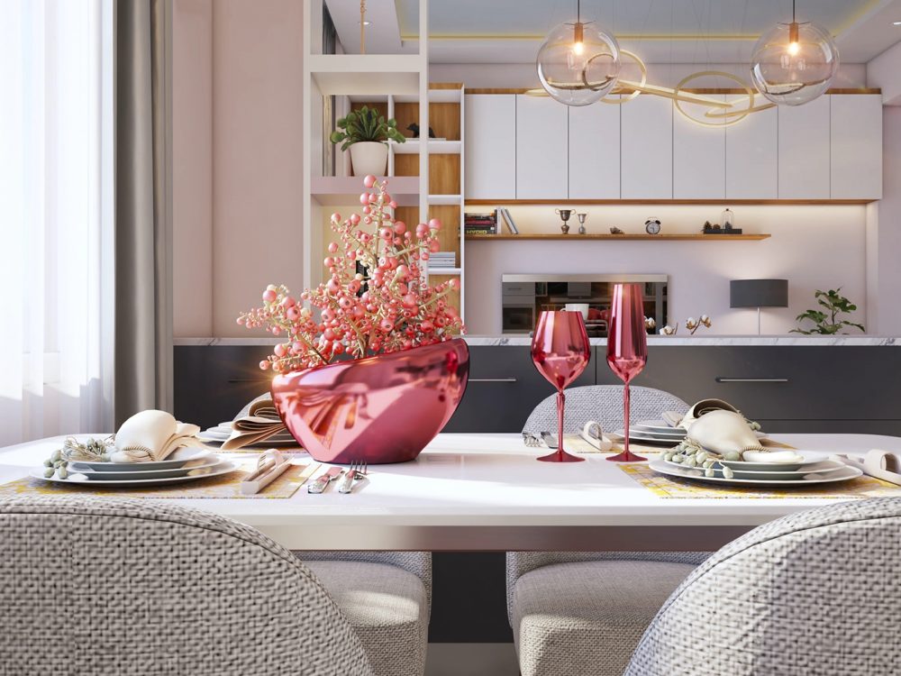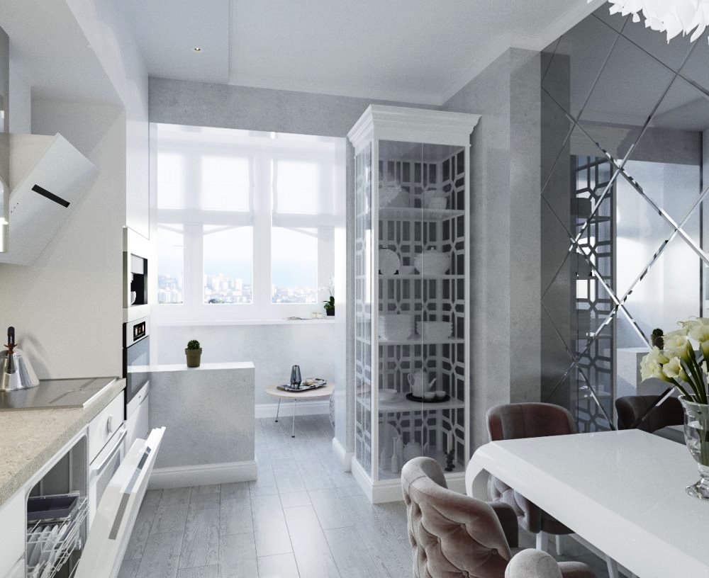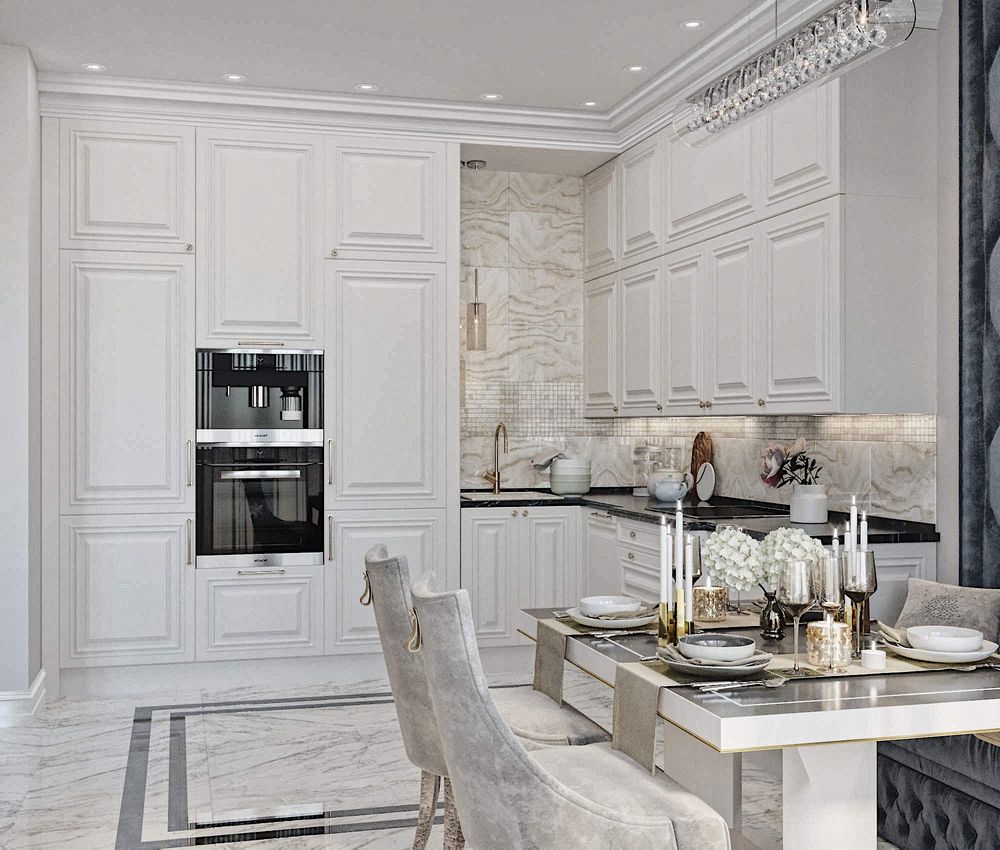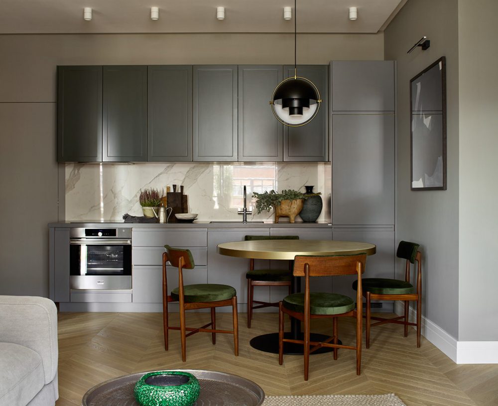 Обеденный стол можно установить в соседней зоне, таким образом визуально разделив на кухню и столовую