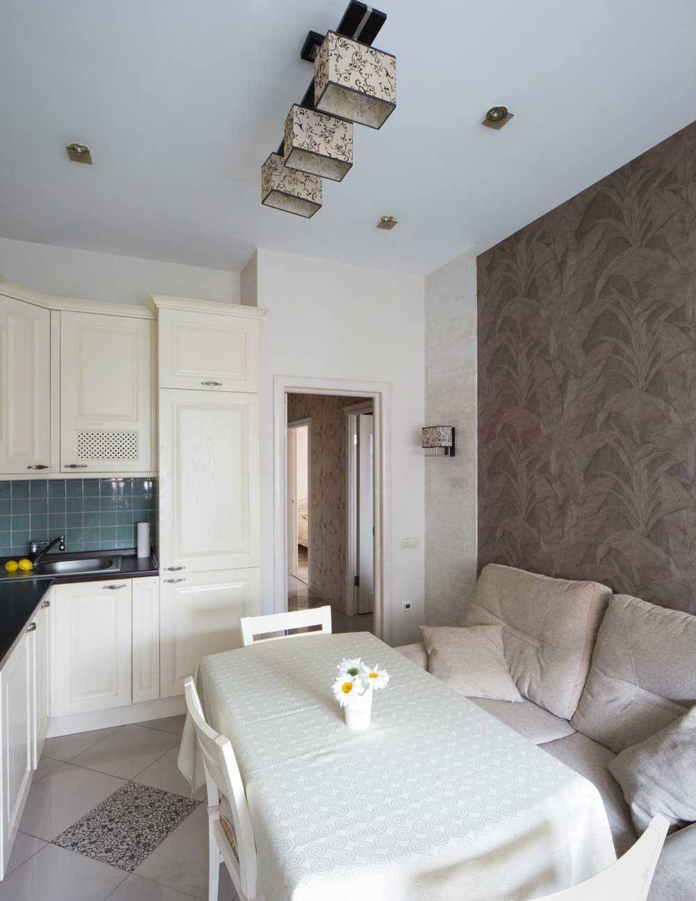 Выбирая классику, закажите резные фасады для кухни, имитирующие природное дерево. Классический стиль приветствует красивое и богатое оформление окон, жалюзи не приветствуются. Пусть балконные обширные окна закрывают тюль и шторы, не пропускающие свет. Каждый предмет интерьера должен быть добротным и иметь натуральные цвета и оттенки. Стиль негативно принимает новомодную бытовую технику, поэтому микроволновые печи, мультиварки и прочее должны быть максимально спрятаны за дверцами шкафов. Освещение может быть различным по яркости, но светильники и потолочные люстры в классике – это закон.