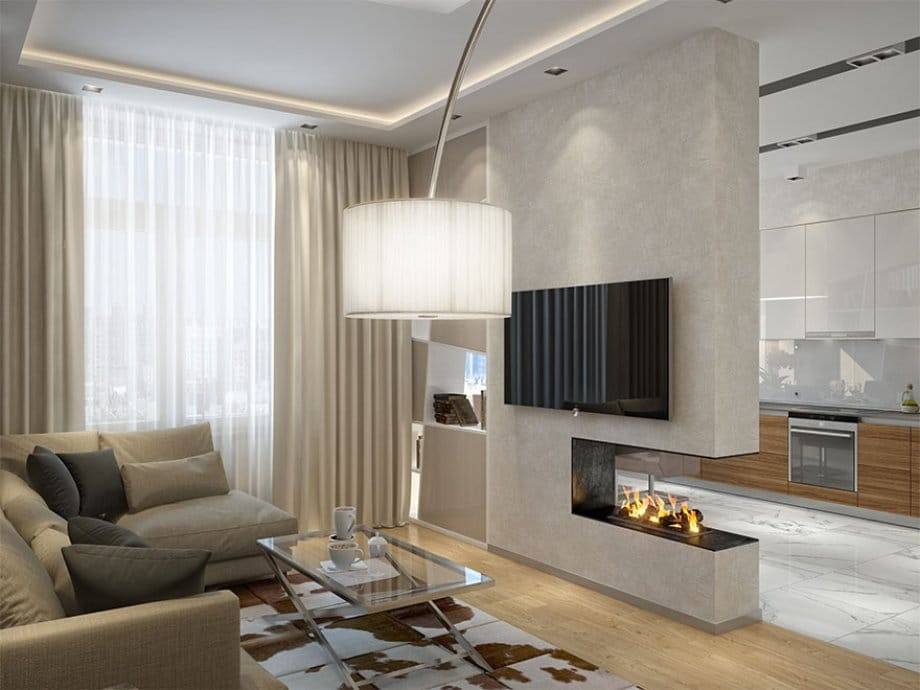 Для разграничения кухни и гостиной также подойдет яркий акцент в виде электрического камина, просматриваемого со всех сторон.
