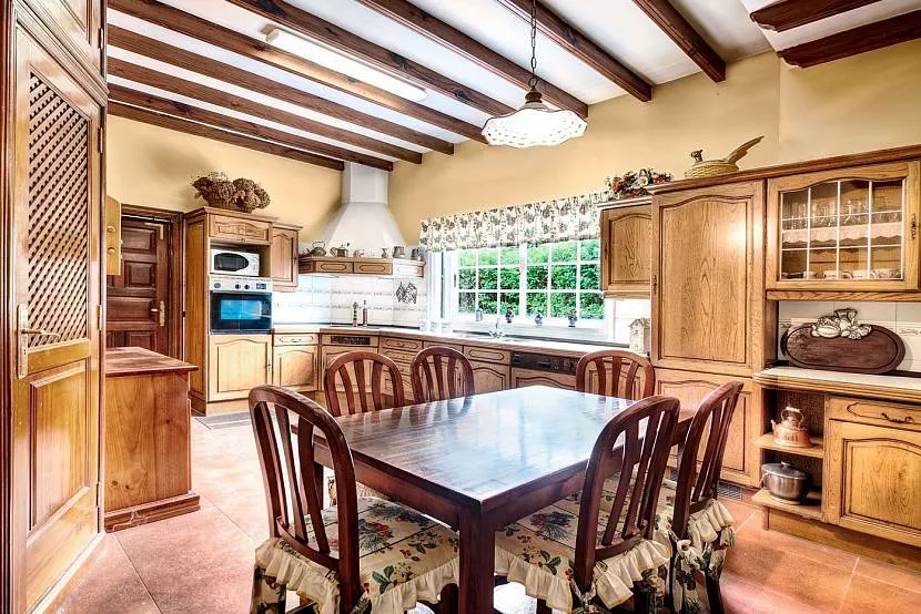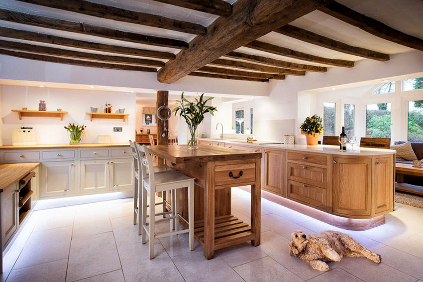 Дизайн деревенской кухни не испортит потолок из балок