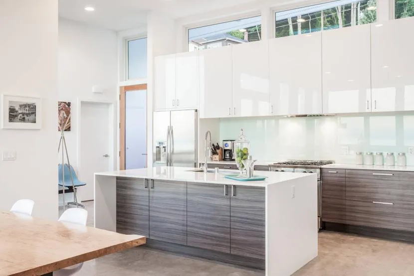 Используют в интерьере глянцевый пластик, изделия из нержавейки, светлую древесину. Великолепно смотрится сочетание стеклянных элементов и пластика. Они образуют ровные и гладкие поверхности. Можно заказать новейшие материалы, удачно имитирующие природные варианты.