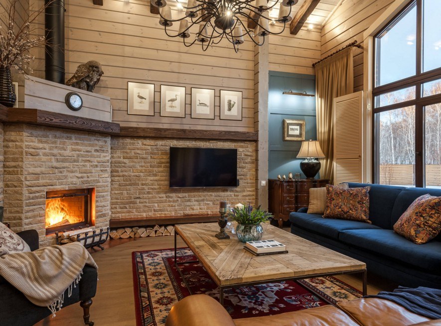 Стены зашиты деревом, чаще всего панелями из бруса. Зона вокруг камина декорирована природным камнем с минимальной обработкой.
