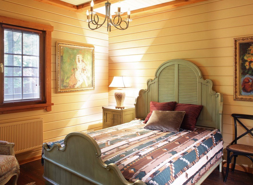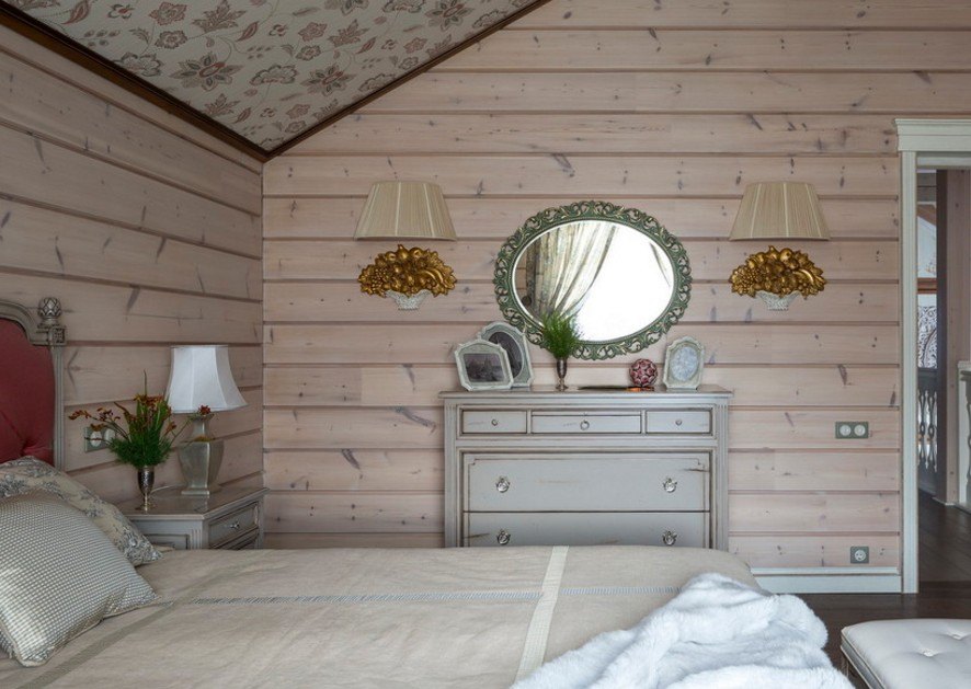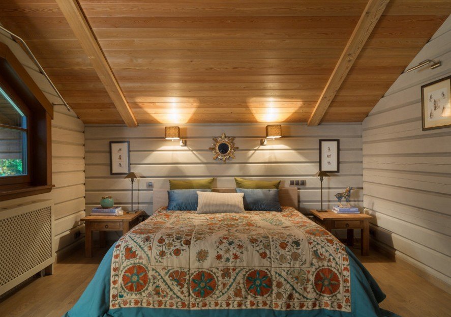 Потолок в спальных комнатах делается из дерева, оно может быть обработано антисептиком и смотреться грубовато