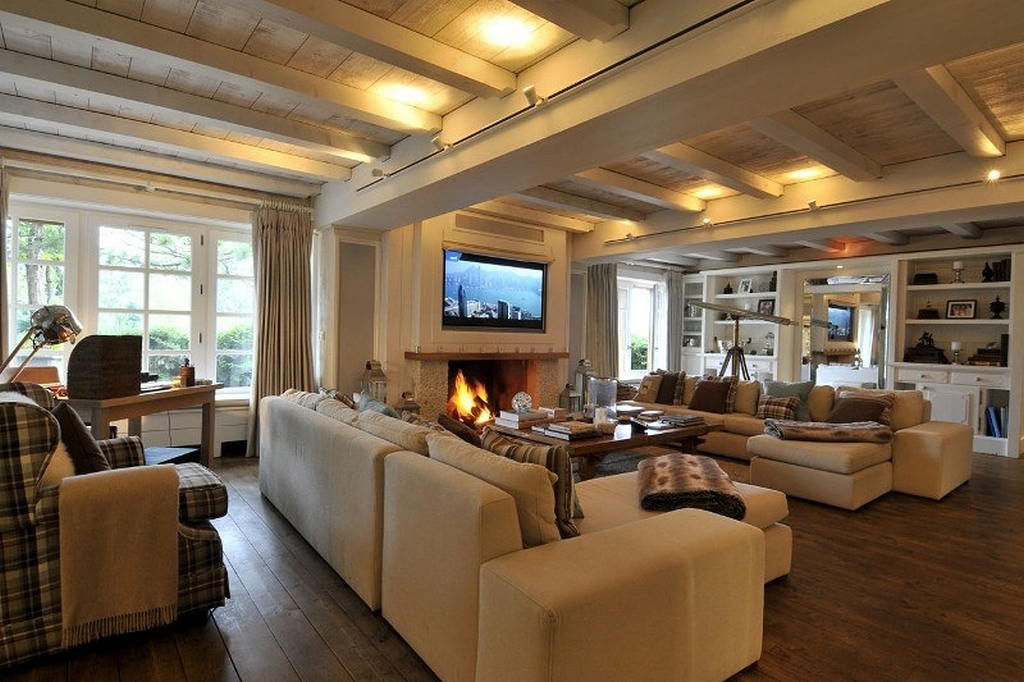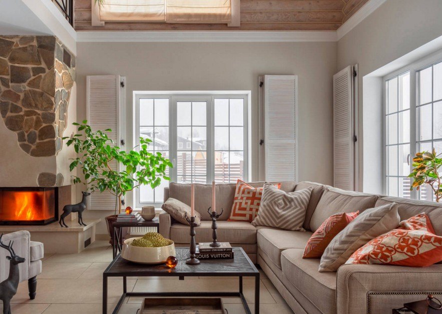 Центральное место гостиной отводится добротному, выложенному из цельного камня камину. Согревающий и уютный, он собирает около себя всех членов семьи и гостей.