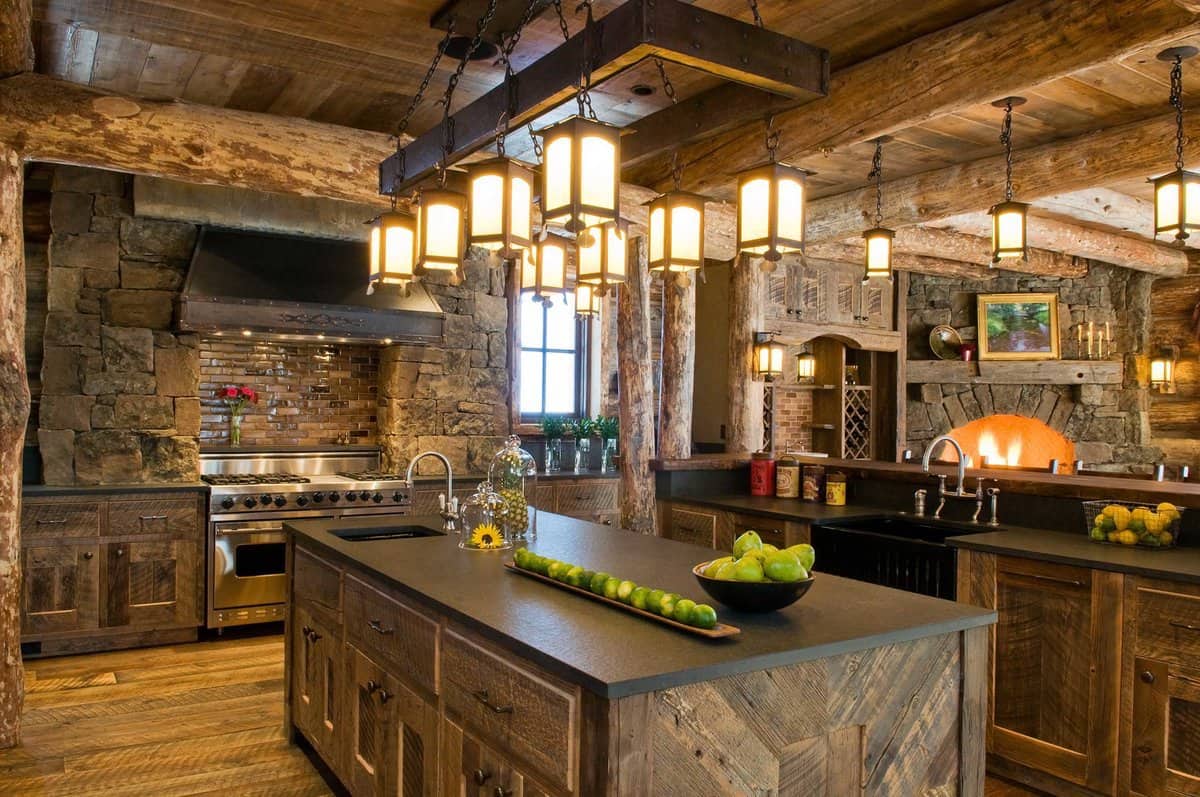 Модные керамзитовые и гранитные поверхности легко вписываются в альпийский интерьер. Предпочтение чаще отдается серому цвету. Если в кухне много темного дерева, предпочтение отдается теплым и стильным бежевым оттенкам.