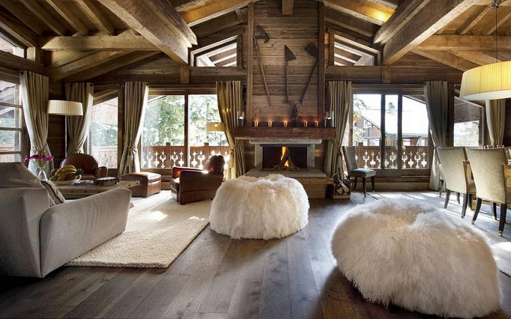 Кожа, лен, велюр, шерсть, мех – фактуры, к которым приятно прикоснуться руками. Шкура, небрежно брошенная на пол или повешенная на стену, вязаный плед на кресле, теплый ворсистый ковер ручной работы, шторы с подхватами придают шале неповторимое очарование.