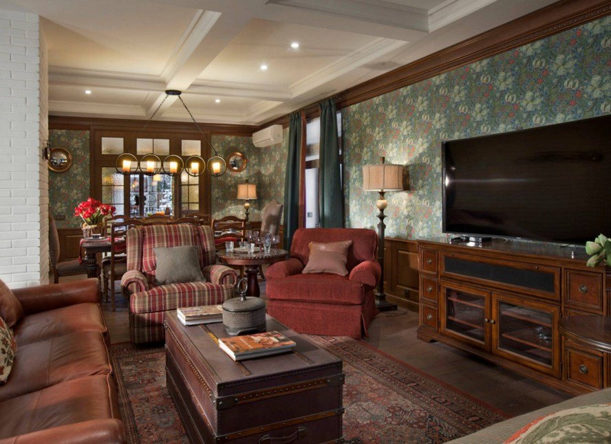 Большие гобелены, холсты классической художественной школы в деревянных рамках с изображением природы, животных и сцен охоты завораживают взгляд. Охотничье оружие, развешенное на стенах, помогает придать интерьеру своеобразный колорит. В фермерском прочтении стиля можно встретить прикрепленные к стене орудия труда.