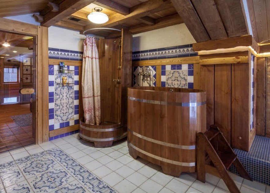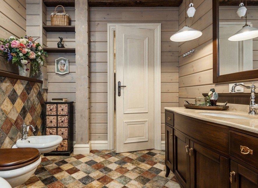 Самый простой вариант – деревянный потолок, плитка имитирующая камень и обилие деревянной некрашеной мебели.