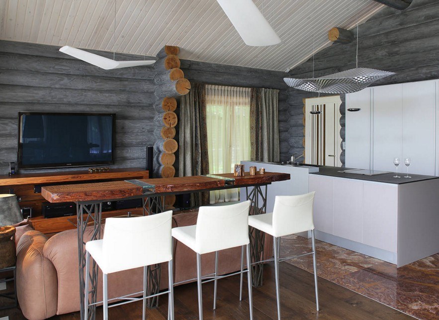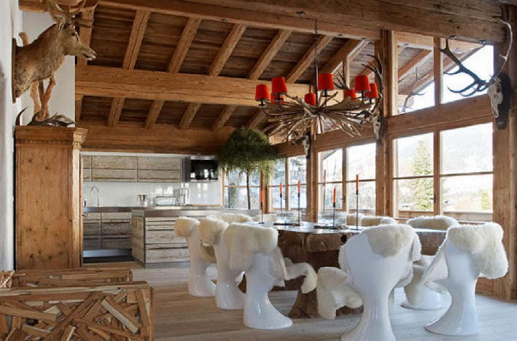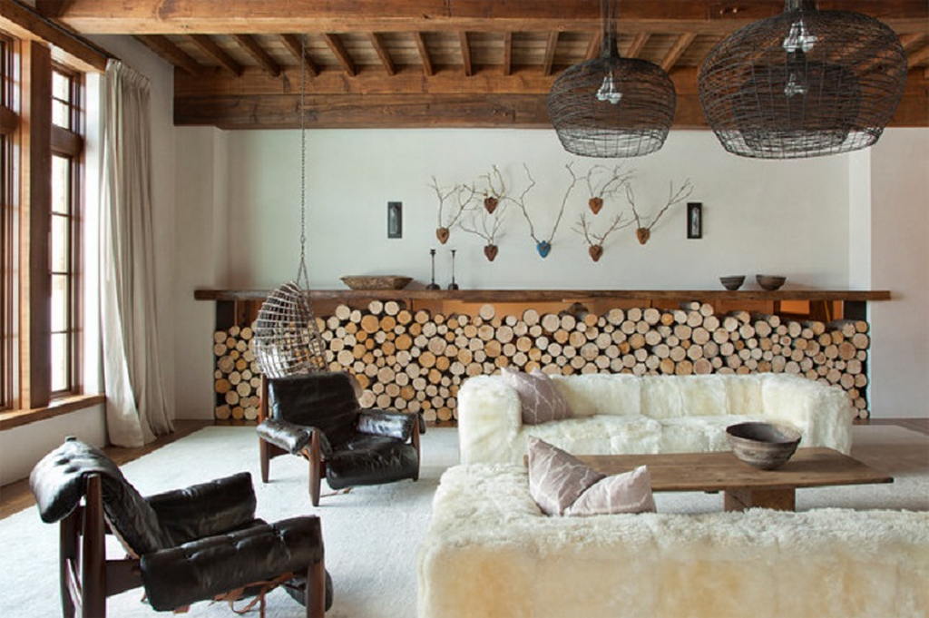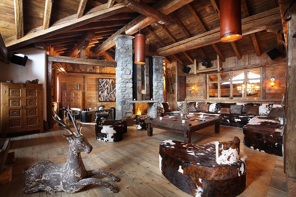 На фоне искусственно состаренных деревянных и каменных поверхностей смотрится необычно. Подобные дизайнерские решения могут быть применены в любой комнате. Наиболее характерны они для гостиной шале.